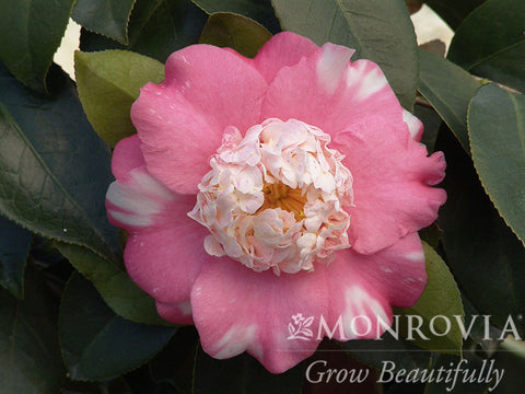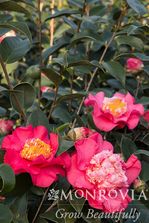 Spectacular blooms with an anemone form contrast beautifully with the glossy foliage. A prized shrub for milder regions of the United States. Use to dress up lightly shaded beds and foundation plantings, or for a flowering evergreen hedge.