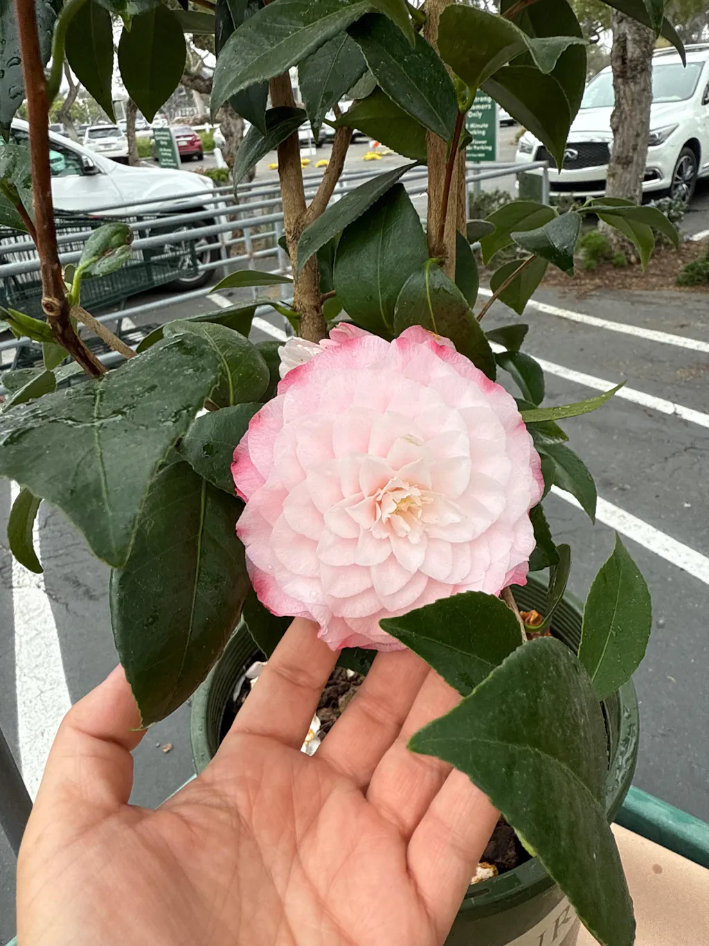 Spectacular, fully double blooms with pure white petals edged with an orchid pink blush. Flowers make a dazzling contrast against the glossy, dark green foliage. Adds an elegant, formal appearance to any garden. A mid-season bloomer. Evergreen.