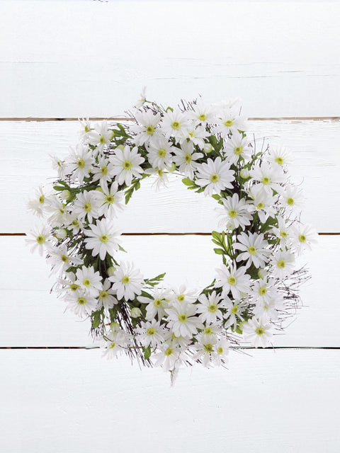 Fresh and timeless, this White Daisy Wreath brings a cheerful charm to your home décor. Featuring lifelike white daisy blossoms with bright green centers and leafy accents, this design captures the beauty of spring and summer blooms. Perfect for brightening up doors, windows, mantels, or walls, it adds a touch of welcoming simplicity to any space.