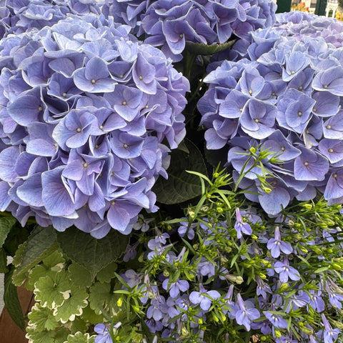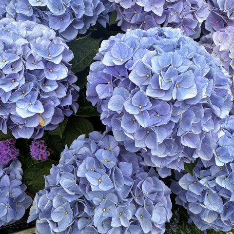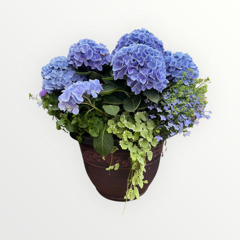 Hydrangea features bold balls of blue pink or white flowers at the ends of the branches. Hydrangeas can be planted outdoors in the shaded garden or a large container.