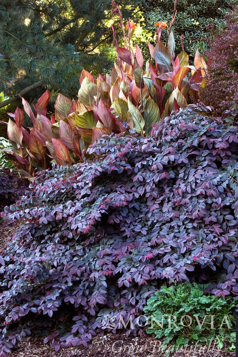 Clusters of pink fringed flowers bloom repeatedly throughout the year. Showy burgundy foliage matures bronze-green, maintaining a purple tinge as it ages. Great for containers, borders, and foundation plantings, as a specimen or in groups.