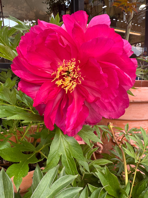 Big double blooms have vibrant, deep magenta-red petals. Flowers are held closer to the foliage, creating a compact, rounded form that requires no staking. Mildew-resistant foliage stays attractive all season long. Perennial.